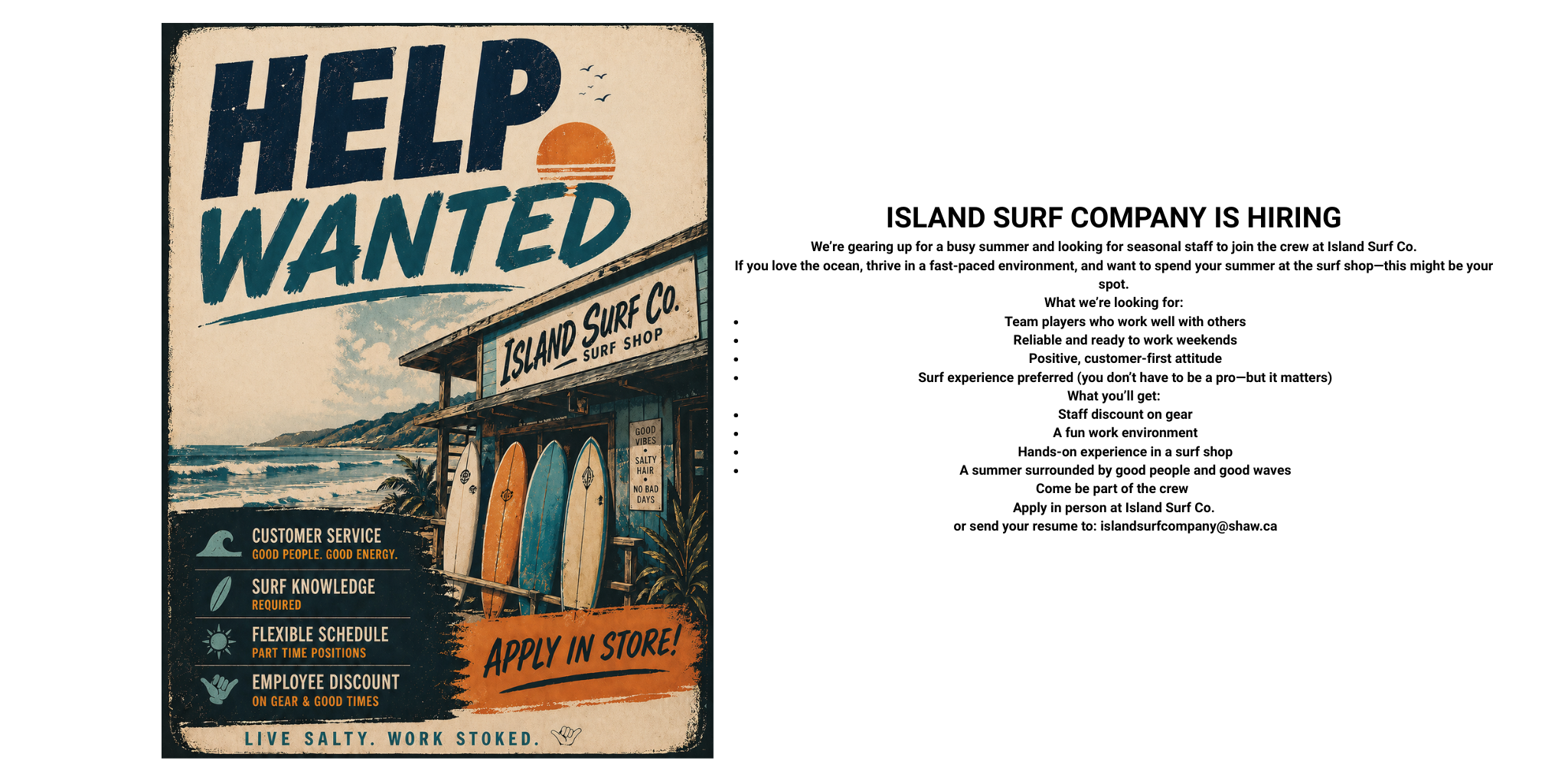 Supporting a brick-and-mortar surf shop matters. When you shop local, you’re not just buying gear—you’re investing in your neighbourhood, supporting local jobs, and helping keep surf culture alive at the community level. Unlike big online retailers, we’re here every day, sharing knowledge, cheering on local surfers, and giving back to the place that supports us. Island Surf Co. exists because of this community, and we’re committed to continuing to grow alongside it.