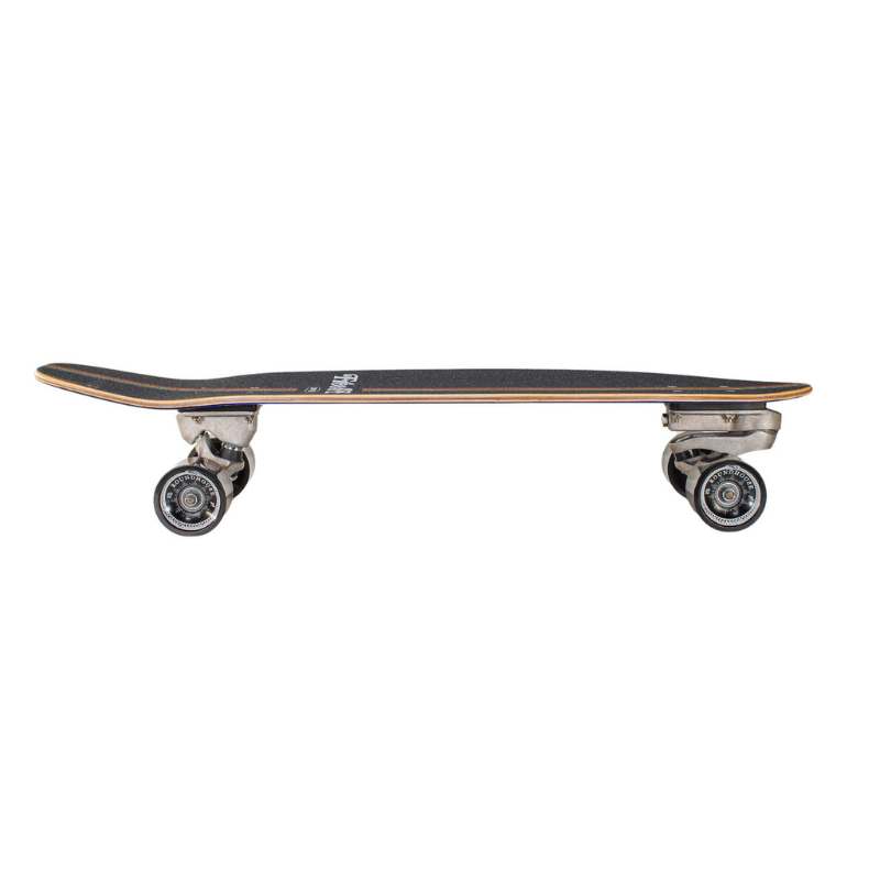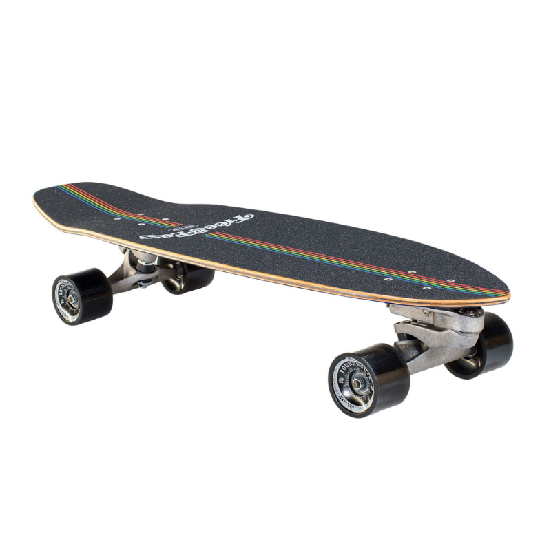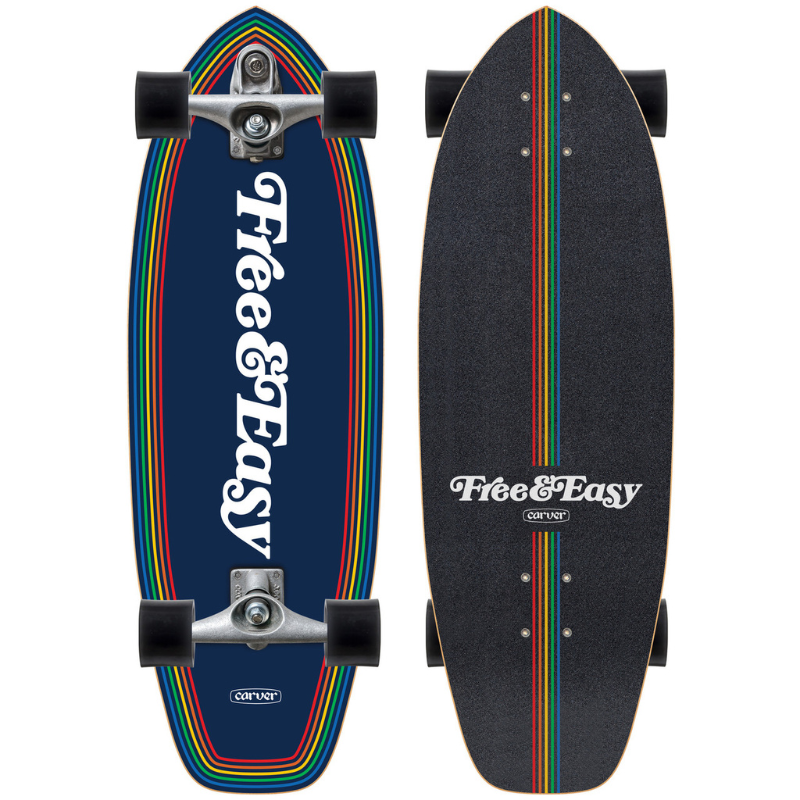 30.75” PRISM - The Carver x Free & Easy Prism surfskate boasts bold, retro lines on a navy backdrop, designed as the ideal everyday shortboard. Perfect for coffee shop cruises and pool sessions alike, this board blends laid-back style with effortless performance capabilities for daily adventures.