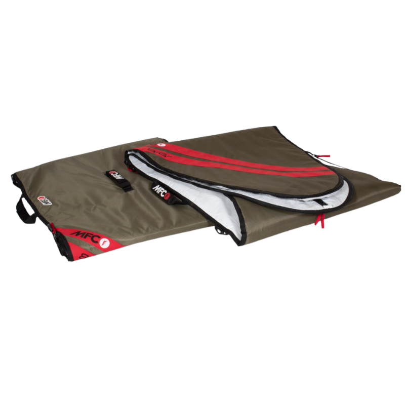 We updated our MFC SUP Single board bag. Now made with the ultralight olive 420D Dobby Ripstop on the top, and the 120gr white tarpee at the bottom and inside, the SUP fits most common SUPs in the market. A PK Marine plastic zipper that does not corrode, together with two EVA molded handles, side and centre for easy carry, and the addition of the AirVent® system make this bag the perfect option to protect your board on a daily base commute as well as a great companion for your travels. The bag comes ready to plug your favourite shoulder strap and allow you longer howls.