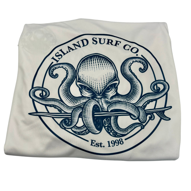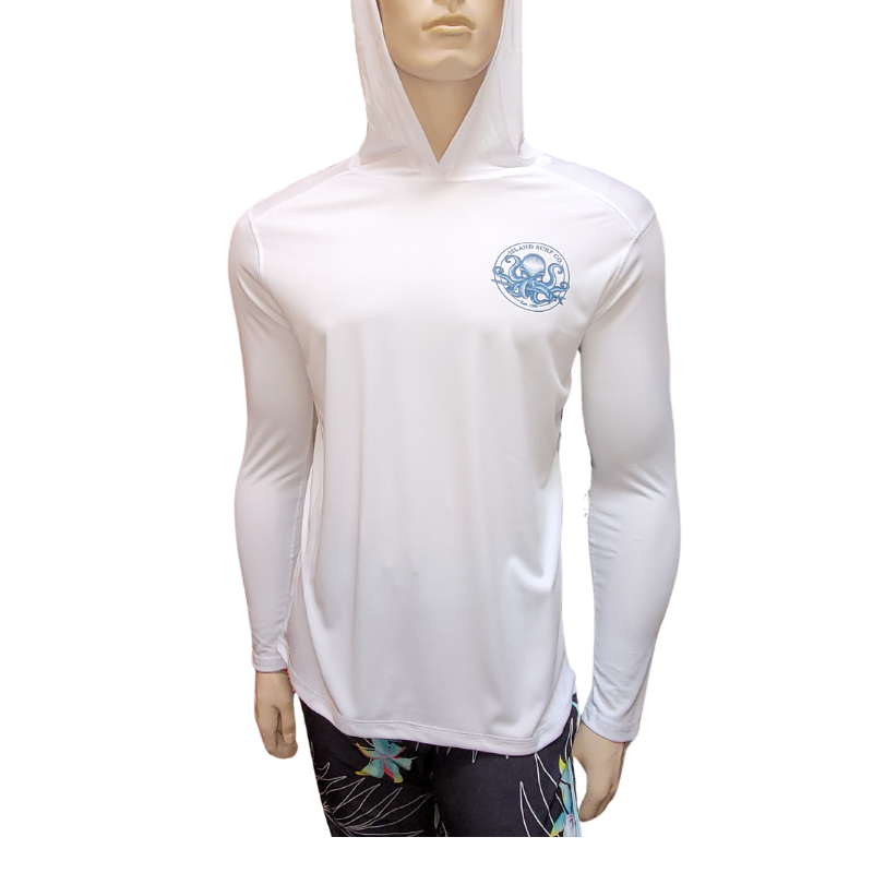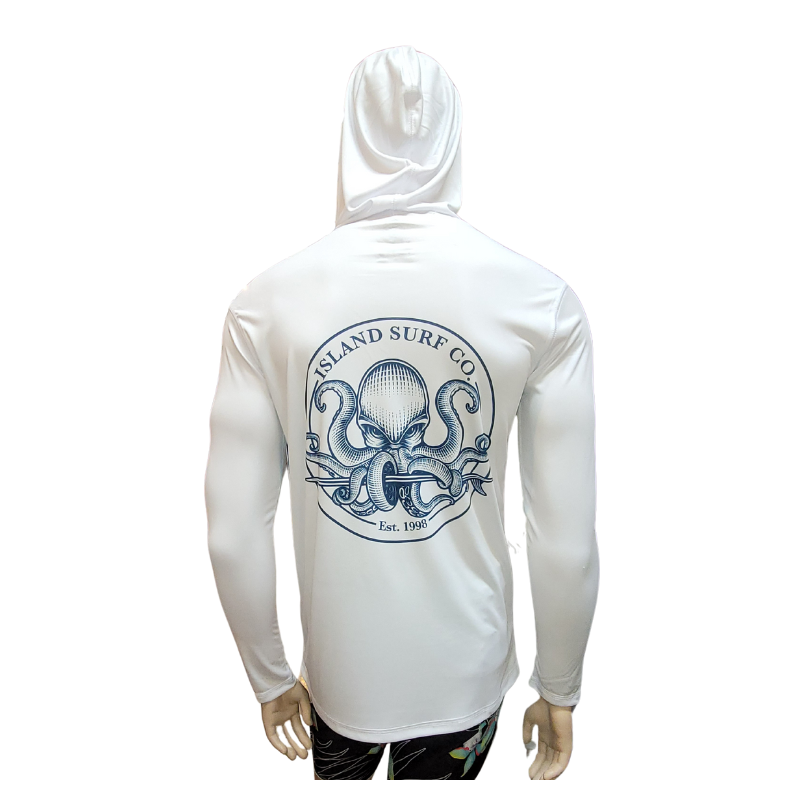 Stay protected from the sun's harmful rays with our UPF 50+ Sun Protection Hooded Kraken Logo! Featuring a crisp white design and a comfortable hood, you can now enjoy your outdoor adventures without worrying about sun damage. Embrace the ocean life with confidence!