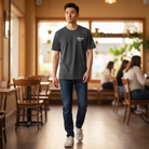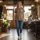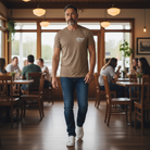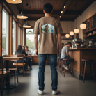 Picture the edge of a misty West Coast forest just after sunrise. Tall evergreens drip with dew, and the air smells like cedar and salt. From between the shadowed tree trunks, a massive figure steps forward — broad shoulders, long powerful arms, and thick, sun-touched brown hair moving gently in the coastal breeze.