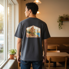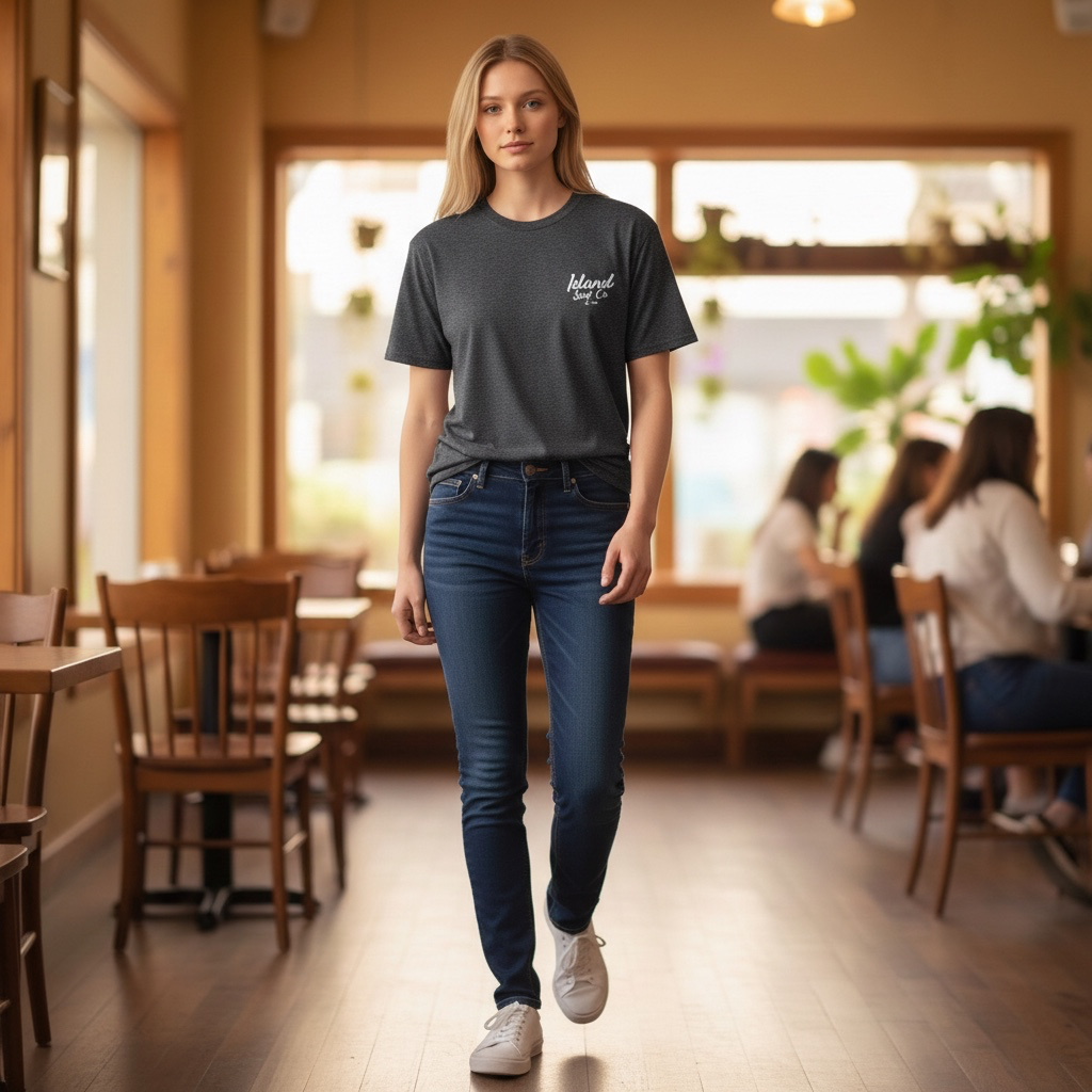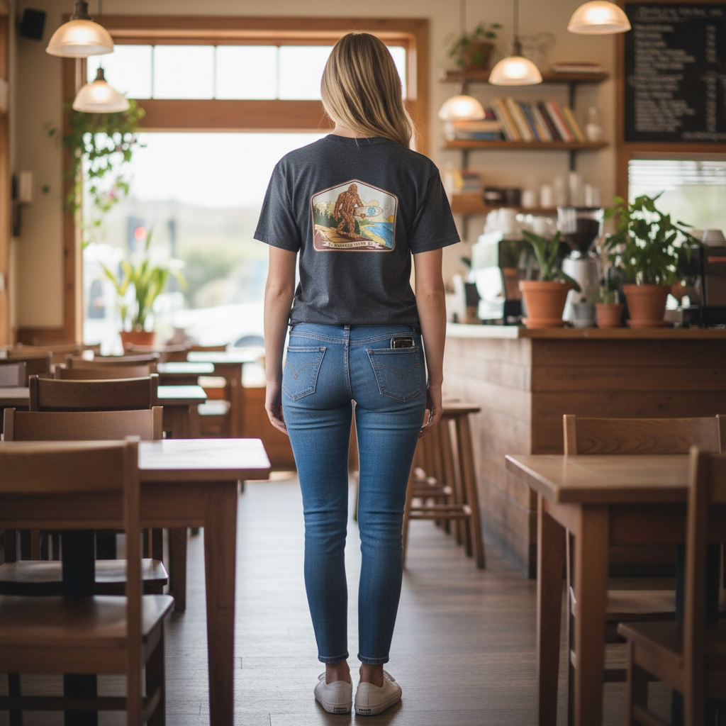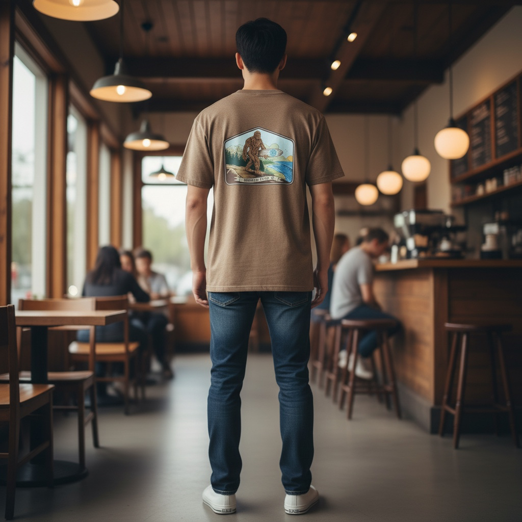 Sasquatch emerges slowly from the woods, leaving soft, oversized footprints in the damp earth. In one long arm, tucked effortlessly under his side, is a well-worn surfboard — waxed, slightly sun-faded, Island Surf Co Logo in the centre.