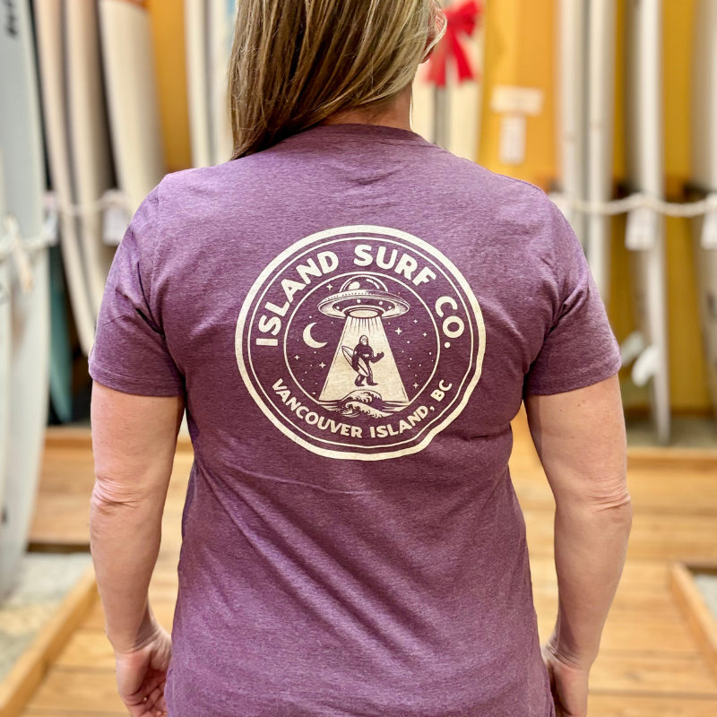 Go out of this world in style with the Sasqualian Ladies Cut T-Shirt! Featuring a sasquatch surfer getting abducted by aliens, this tee is out of this world. (Limited quantities available!)