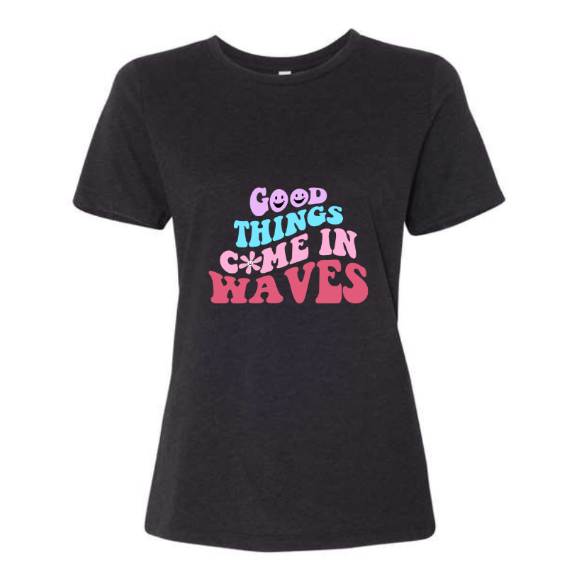 Ride the good vibes with our Good Things Come In Waves T-Shirt! Made with premium materials and designed to flatter a woman's figure, this shirt embodies the idea that good things come in waves. It's perfect for those who believe in positivity and living life to the fullest. Feel inspired every time you wear it!