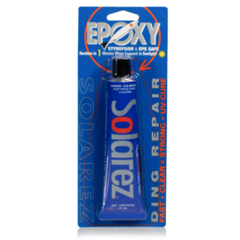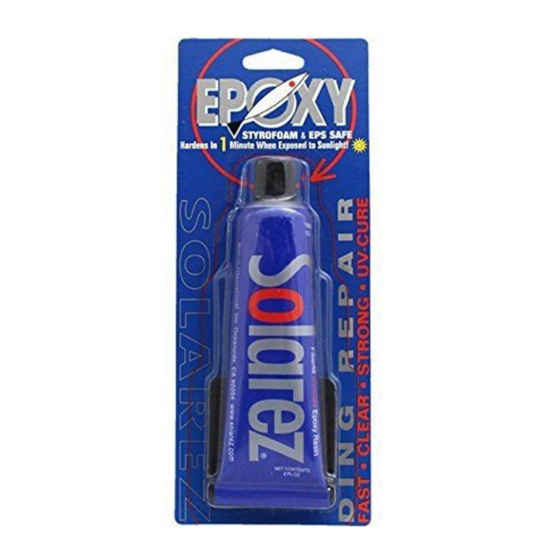 SOLAREZ Epoxy repair putty is a mixture of clear, high strength, fiber reinforced epoxy resin and an amazing solar activated cataylst. There is no mixing required, just use it right from the tube. It gels in 5 seconds, curing in 3 minutes - but ONLY when exposed to sunlight. No mixing necessary. UV curing assues complete hardening. Provides complete crosslinking Remarkably tough and resilient Contains urethanes that keep from yellowing Eco-freindly ZERO vapors, non-flammable. Comes with 60/240 grit sand pad.